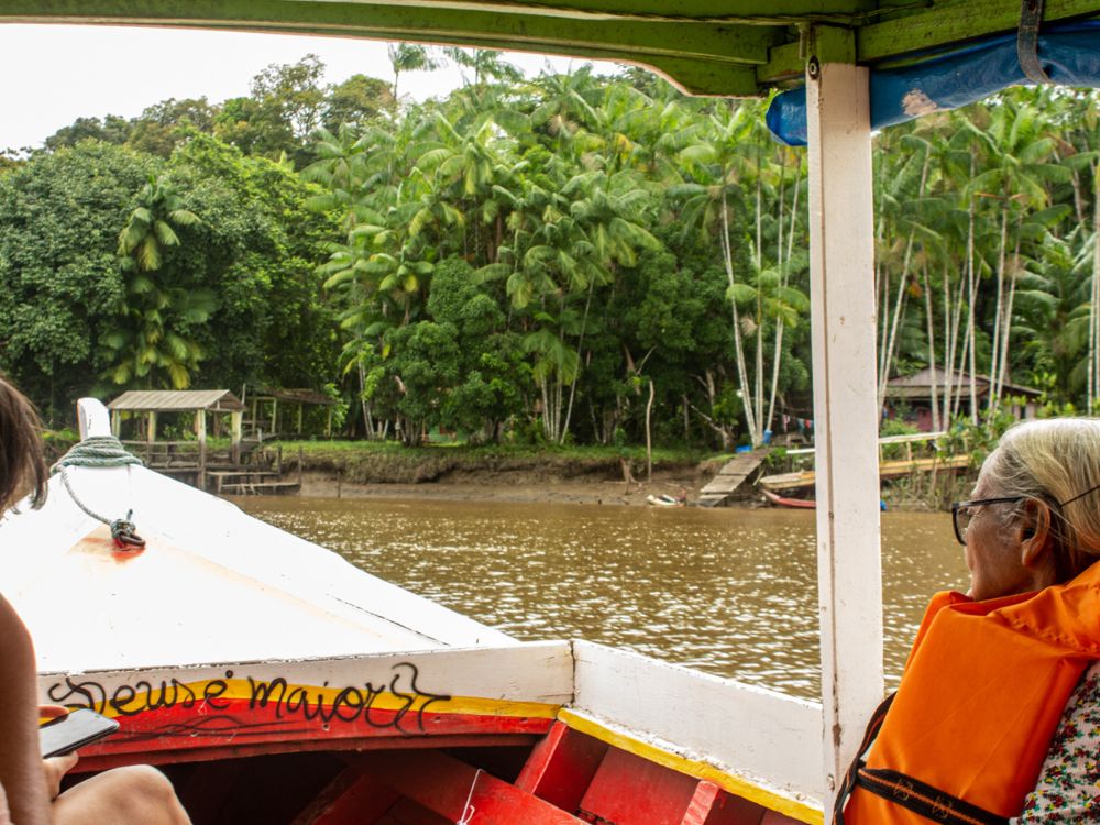14h: Depois daquele descanso pós açaí do grosso, é hora de dar tchau! Como tudo que é bom dura pouco, temos que retornar a cidade de Macapá. Pegamos nosso barco mais uma vez.
