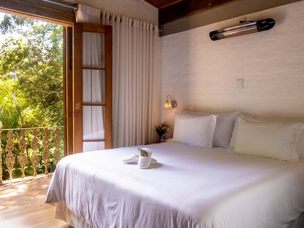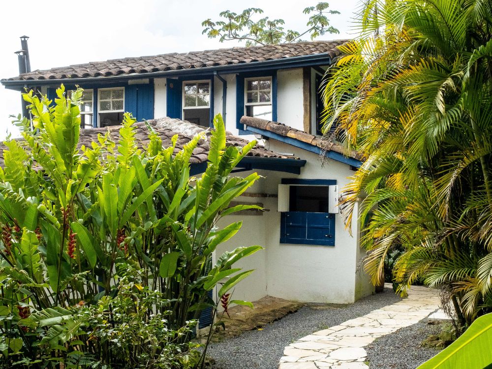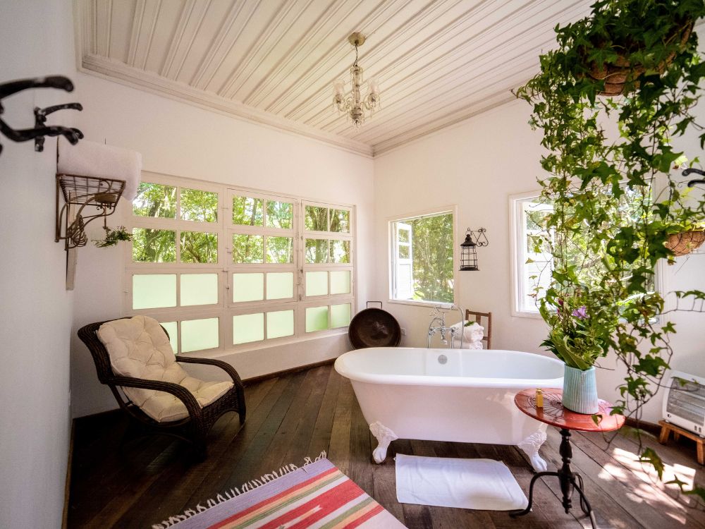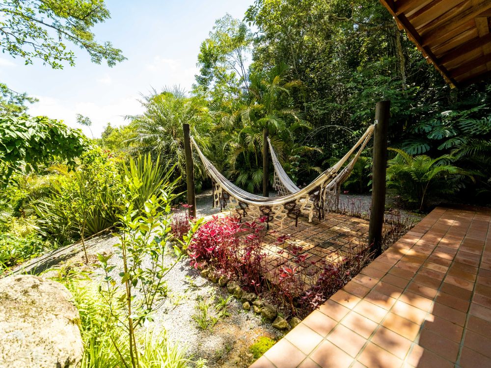Casa Manacá: para relaxar e apreciar a natureza, a casa conta com uma confortável banheira com hidromassagem, um amplo quintal com redes e fogo de chão emoldurados por um paisagismo delicado, que se integra, insinuante, à Mata Atlântica.