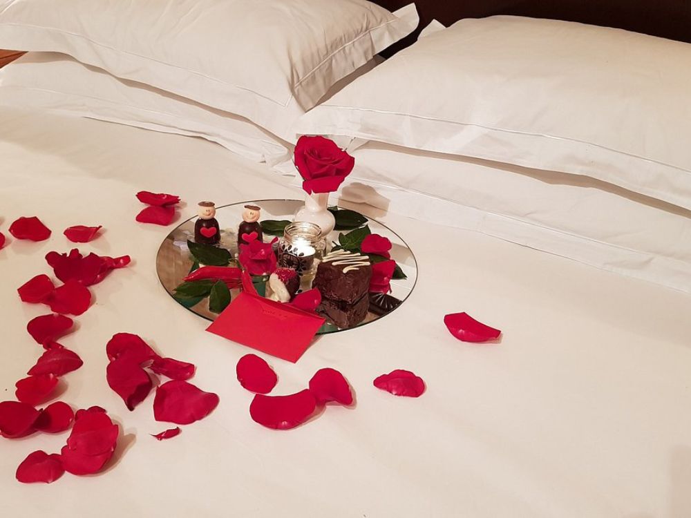 Decoração romântica com rosas vermelhas, porta retrato com foto do casal, garrafa de espumante.