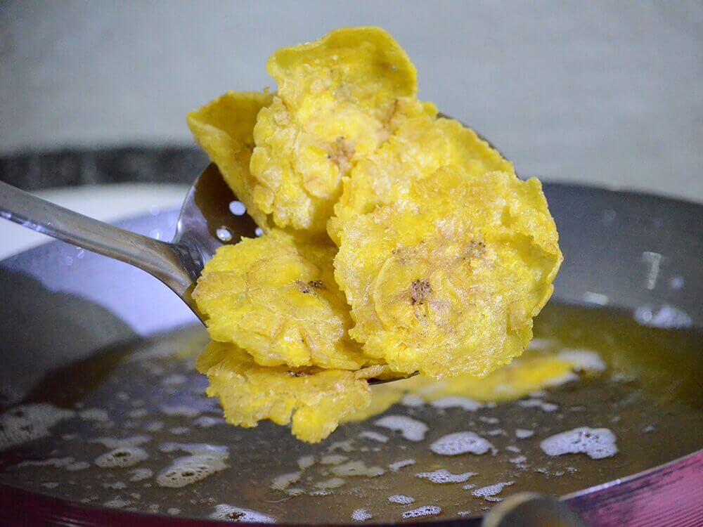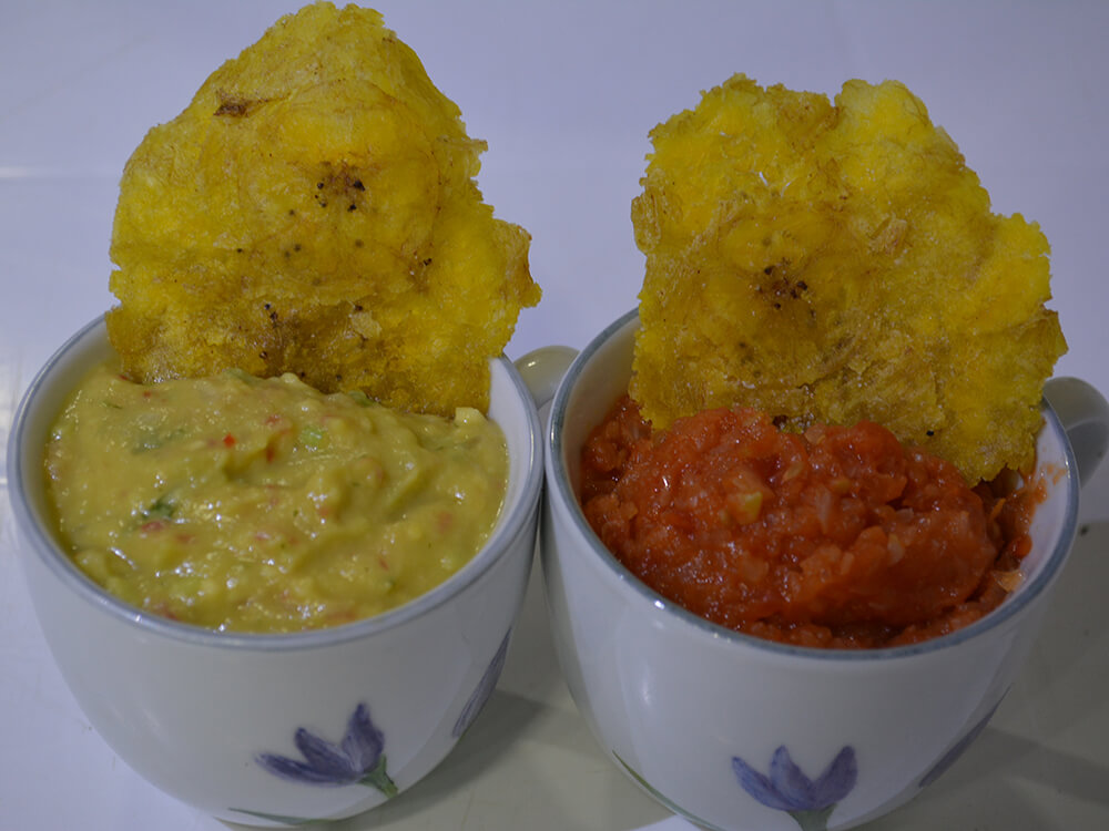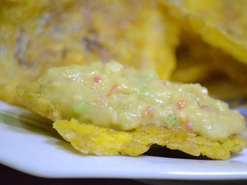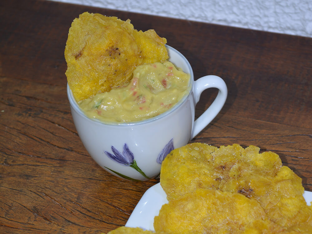 Discos de banana da terra fritos bem fininhos e crocantes, acompanhados de guacamole, molho delicioso que você vai aprender a fazer também! Essa mistura deliciosa é muito comum na Colômbia, geralmente oferecida em ocasiões especiais entre amigos e família.